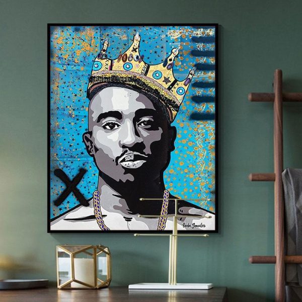 • The painting shows portrait of famous singer Tupac in the crown. It will be an excellent decoration for a modern interior. The picture will look great in a music studio.